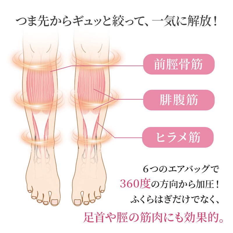 つま先からひざ下までのフットマッサージャー。つま先からふくらはぎへと順に加圧します。加圧センサー搭載で足の太さに関わらずどんな人でも均一な強さでマッサージ可能です。